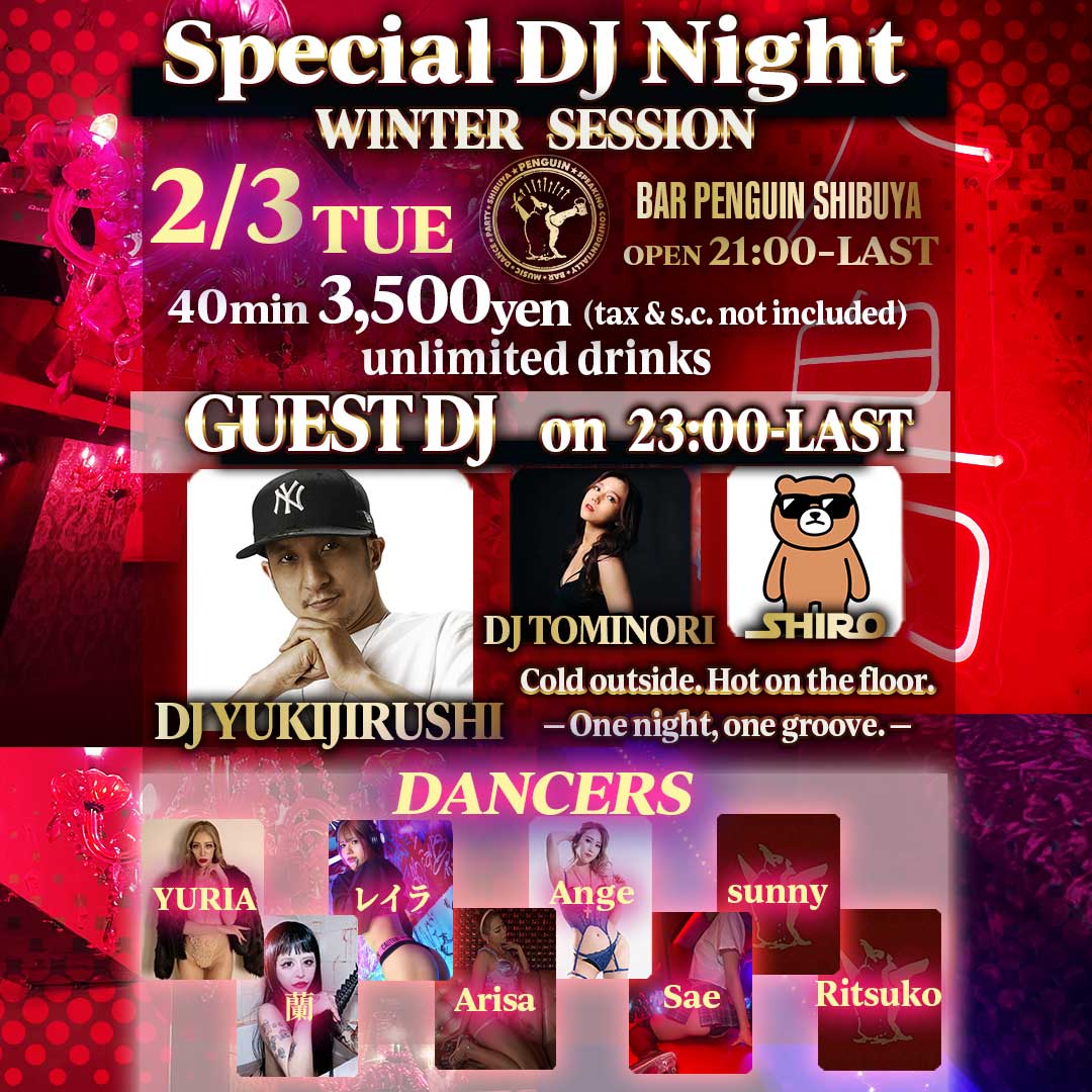 Featuring the legendary DJ YUKIJIRUSHI and a lineup of incredible DJs bringing nonstop grooves to heat up your winter night!! Our sexy dancers will turn up the temperature with their fiery moves, perfectly synced with the electrifying DJ performances ♡♡